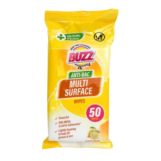 Buzz Multi Surface Antibacterial Wipes 50 Pack Lemon 321592 / 324254 (Parcel Rate)